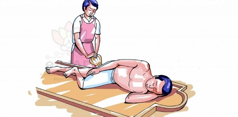 Patient Positioning: The patient is made to lie on their left side, in a relaxed and comfortable position. Prior to the treatment, a gentle abhyanga (oil massage) may be performed to prepare the body for the procedure and to enhance the absorption of the medicated oils.